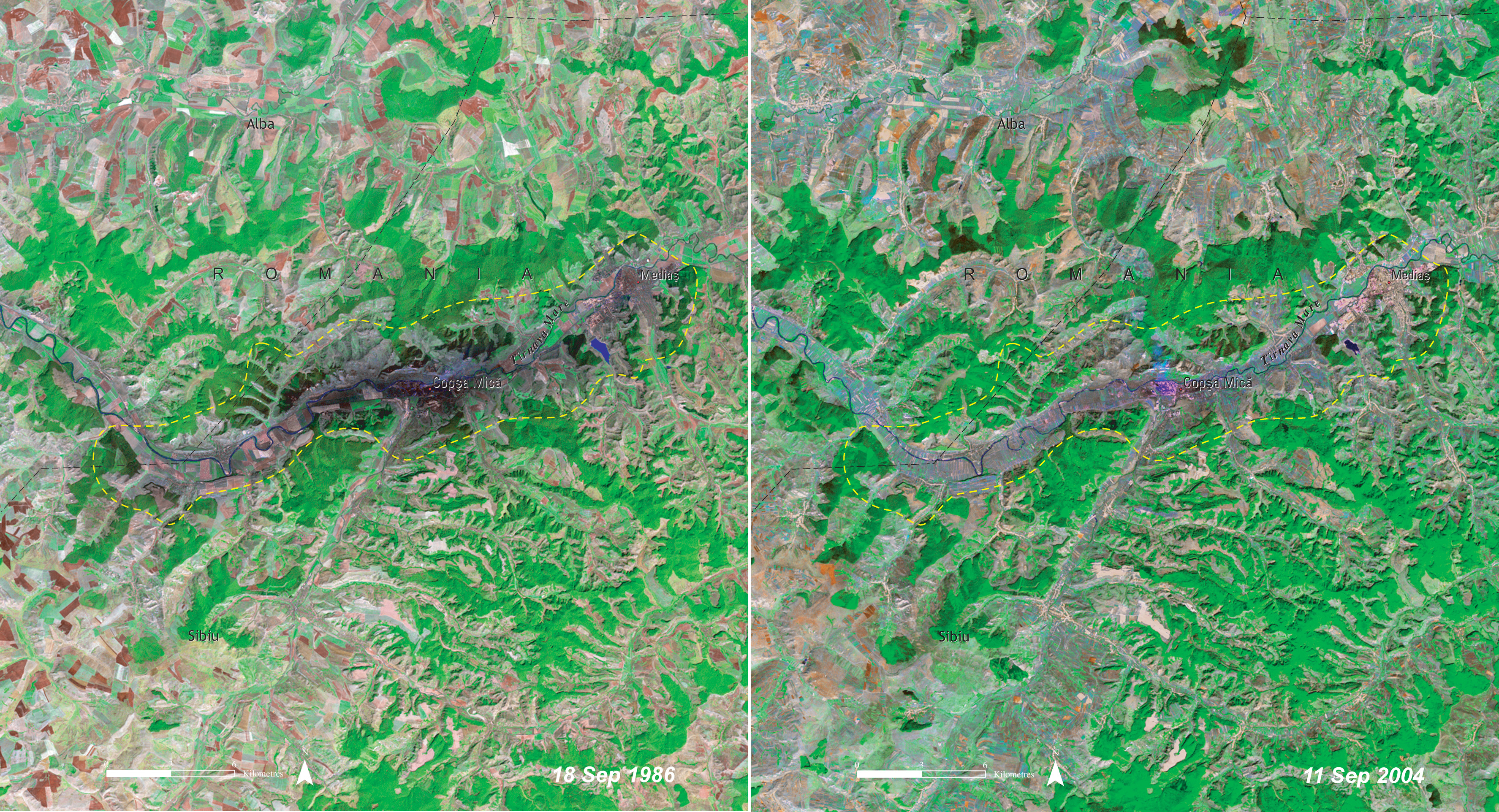Copsa Mica, a small town in Transylvania [at the center of each satellite photo], was considered one the five worst polluted industrial sites of the communist world. A zinc smelter and a carbon black factory spewed heavy metals and black dust over a length of 25 or more miles. With the collapse of communism and closure of many heavy industry sites, the scar has subsided. Only the smelter, now under Greek ownership and stricter pollution control, remains. How long it will take for the soil to flush out its heavy metals from farmlands is not known. For higher resolution click here. Source: United Nations "One Planet, Many People: Atlas of Our Changing Environment" (2005) |