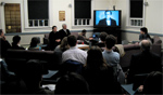 Bttm: Iliesiu at Harvard (left) and MIT showing of "Universitatii" film (rt)