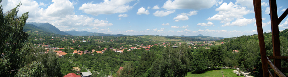 | View from Bran looking west towards Zarnesti and Piatra Craiului (Carpathian Mountains) on the left side of panorama Photo © Dan Dimancescu - Not for use without permission Return to TRAVEL page . . . |